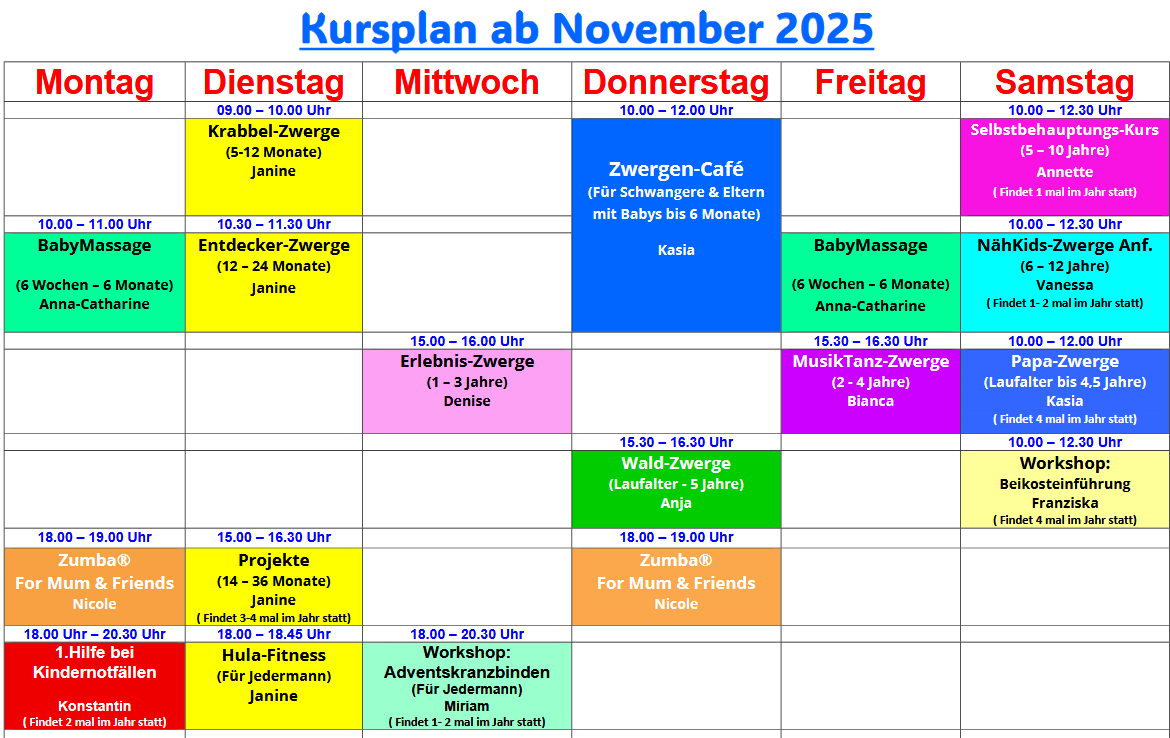 (In den Schulferien pausieren die meisten Kurse und laufen nach den Ferien zur gleichen Zeit weiter)