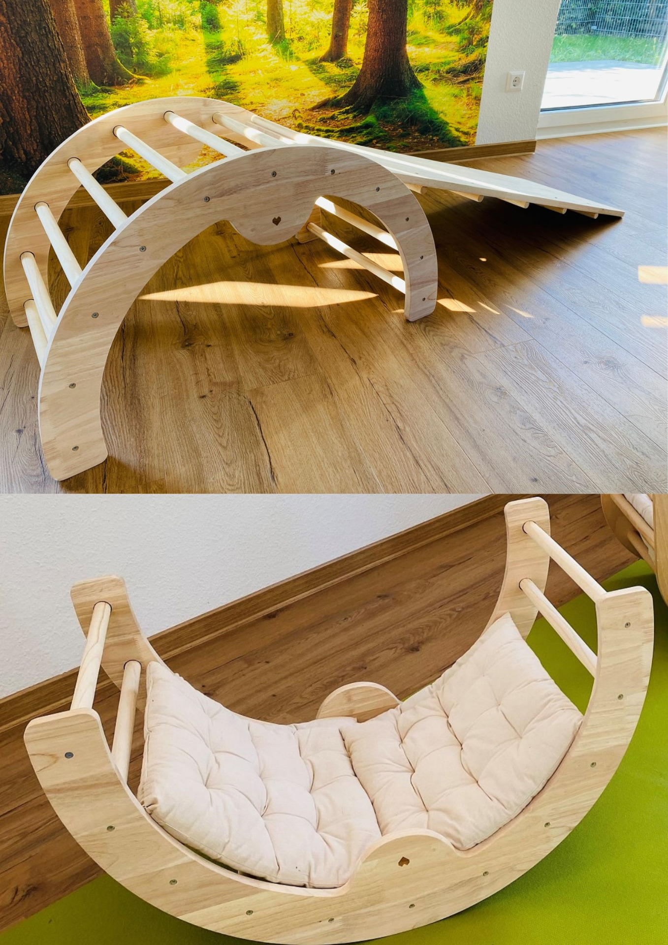 Der Kletterbogen/Wippe mit Rutsche/Hühnerleiter regt das kreative und sensorische Spielen an und fördert Gleichgewicht und Beweglichkeit . Robust und widerstandsfähig dank seiner Verarbeitung aus Kiefernholz bringt er Natürlichkeit ins Kinderzimmer.