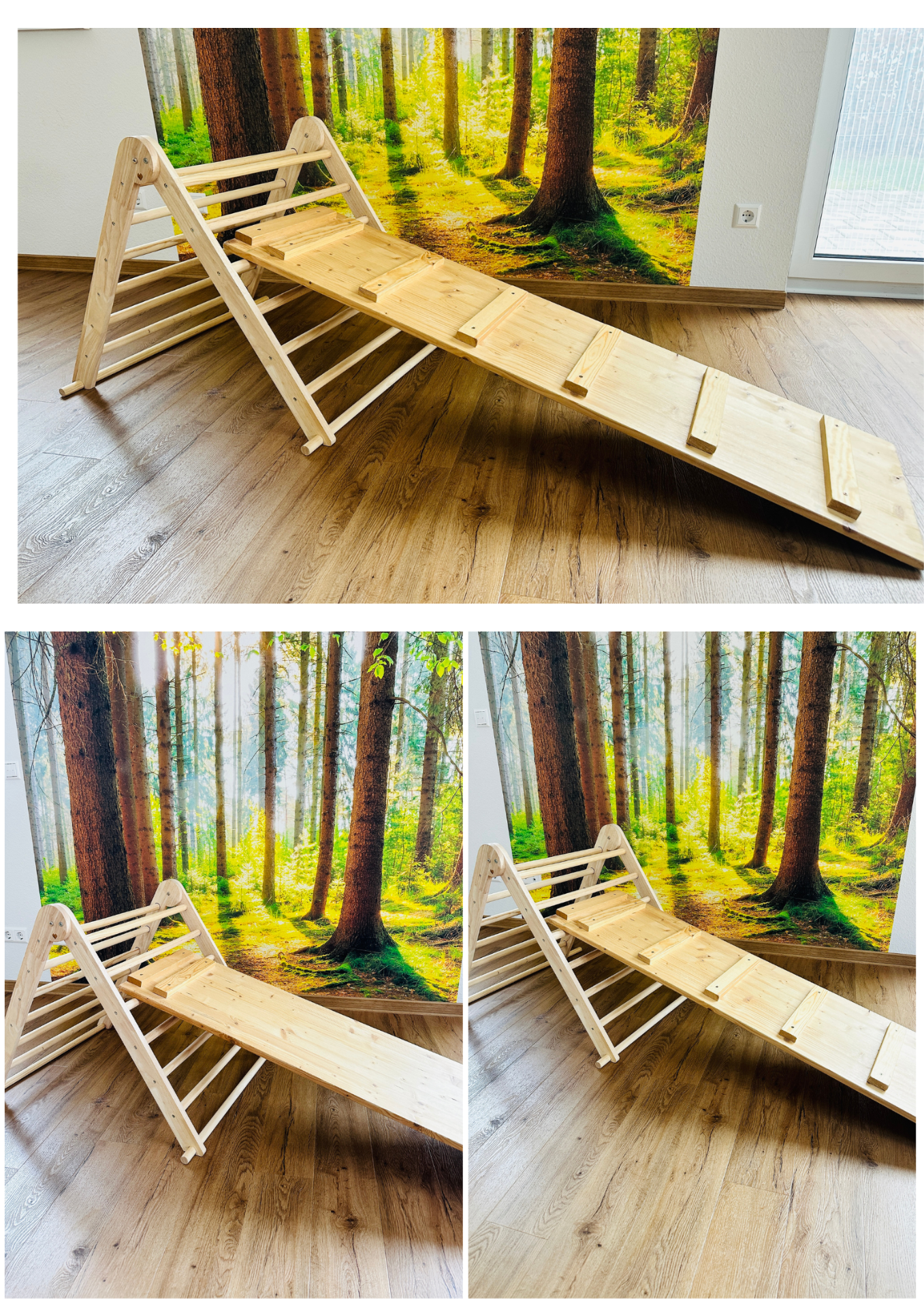 Das Kletterdreick mit Rutsche/Hühnerleiter regt das kreative und sensorische Spielen an und fördert Gleichgewicht und Beweglichkeit . Robust und widerstandsfähig dank seiner Verarbeitung aus Kiefernholz bringt er Natürlichkeit ins Kinderzimmer