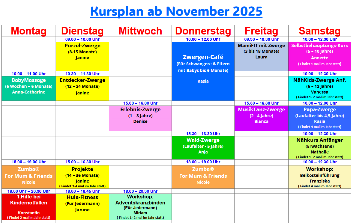 (In den Schulferien pausieren die meisten Kurse und laufen nach den Ferien zur gleichen Zeit weiter)